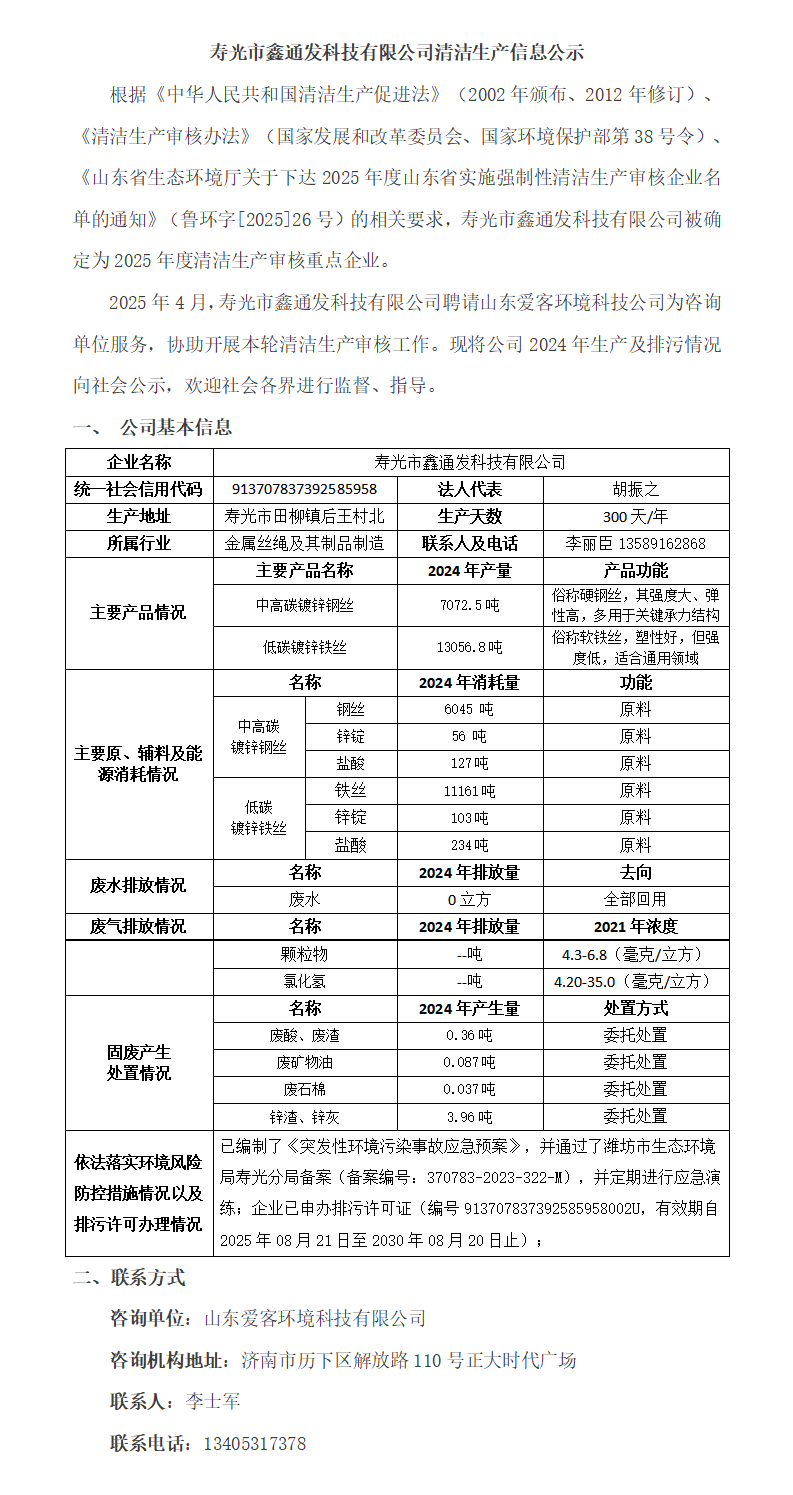 寿光市鑫通发科技有限公司清洁生产信息公示